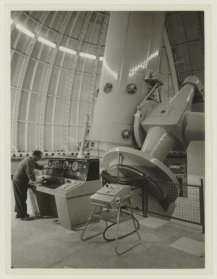 Télescope 193cm de l'Observatoire de Haute Provence - vue intérieure de la coupole : table de contrôle, base du télescope et monture. (titre forgé)