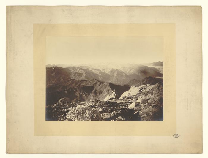 Vue sur les Pyrénées depuis l'Observatoire du Pic du Midi. Une personne pose au premier plan (titre forgé)